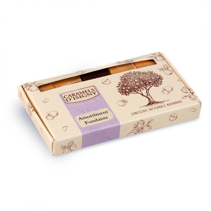 Présentés dans un élégant étui de 140g, ces caramels traditionnels sont fabriqués à partir de beurre d’Isigny AOP, garant d’une texture onctueuse et d’un goût authentique.