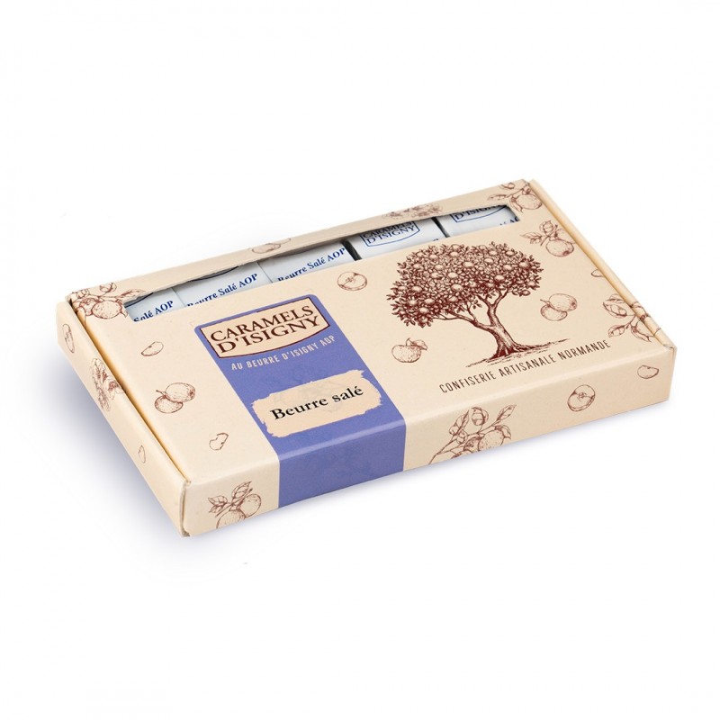 Retrouvez toute la douceur et l’authenticité du terroir normand avec ces délicieux caramels au beurre salé, fabriqués avec soin par les célèbres Caramels d’Isigny.
